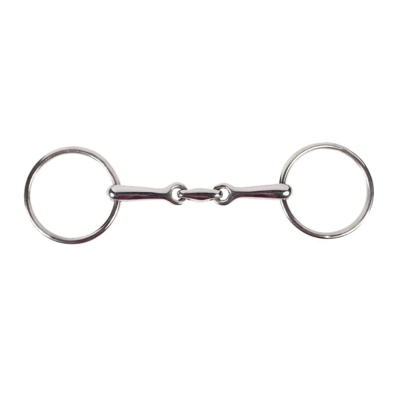 The lozenge style double jointed mouthpiece features a mild action with a stable center piece that limits lateral movement in the horse’s mouth. This bit features loose ring style cheekpieces. Bradoons are used in combination with a curb or Weymouth bit in a double or full bridle. When used in a full bridle the bradoon bit should be sized 1/8″ to 1/4″ larger than your horse’s standard bit size so that the bradoon rings will not pinch or interfere with the curb bit.