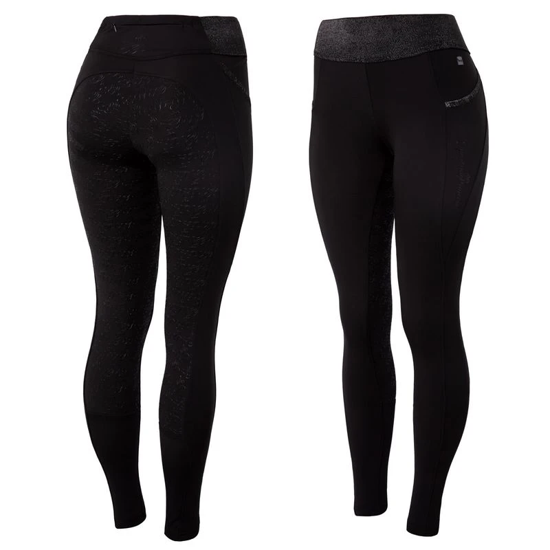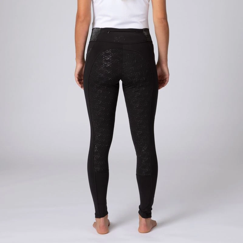 These full seat riding tights are equipped with everything you need to stay comfortable while riding in winter: An elastic waist on warm material with a silicone full seat. Front pockets and a zip mobile pocket in the back keep your belongings safe. A monogram print brings a touch of luxury to these affordable leggings.