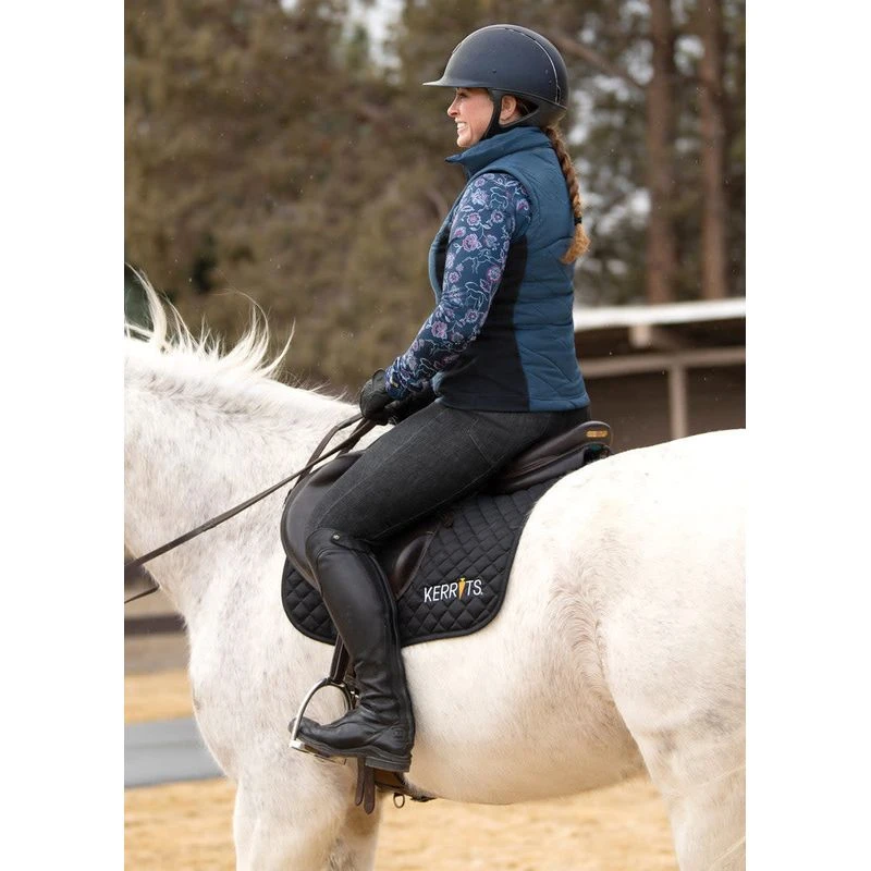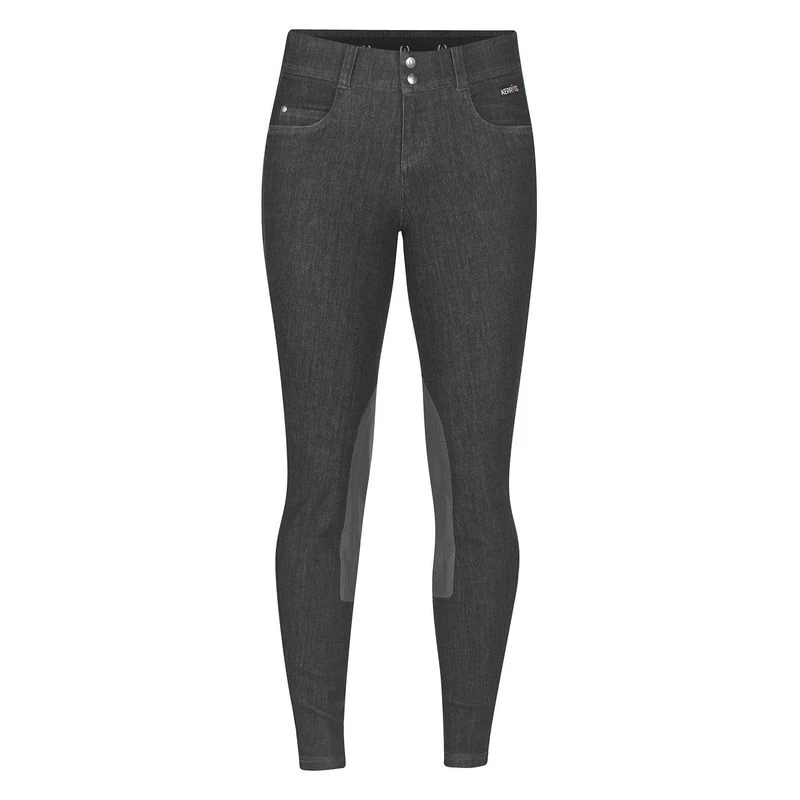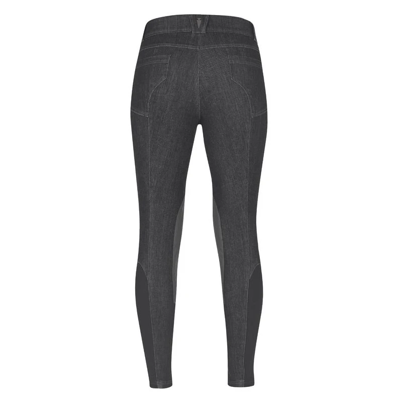 DriRelease stretch denim pulls sweat from the skin to keep riders comfortable. Contoured waistband is shaped for comfort in the saddle. Contrast stitching and slimming back pockets flatter while GripSoft knee patches deliver flexible grip; stretch mesh calf panels vent and cool.
